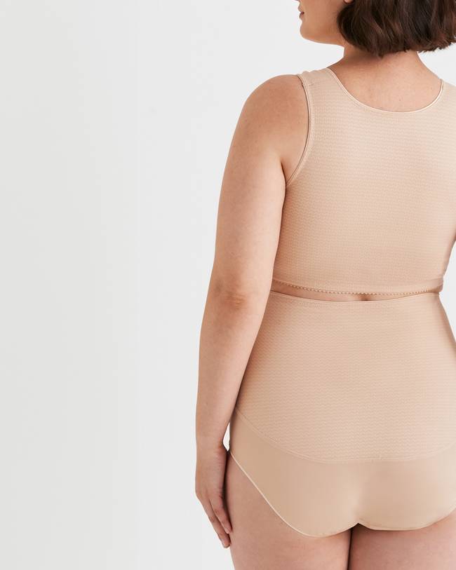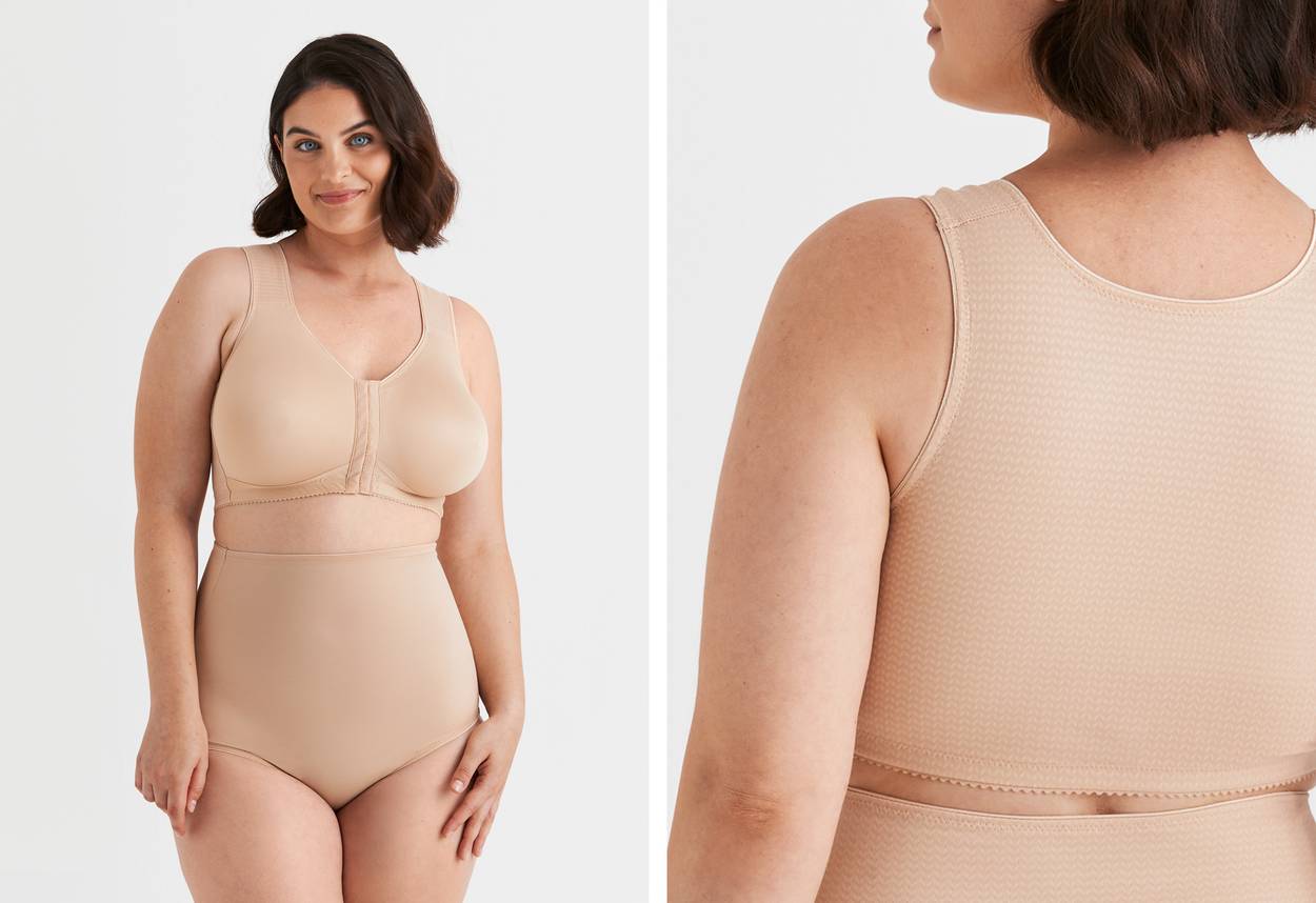 Nova has a front hook-and-eye closure. A front-fastening bra is easier both to put on and take off. If you have limited mobility or difficulty reaching, this is a great option. The closure is also strategically placed, since the material's properties improve the larger area covered. In this case, the beck has full coverage.